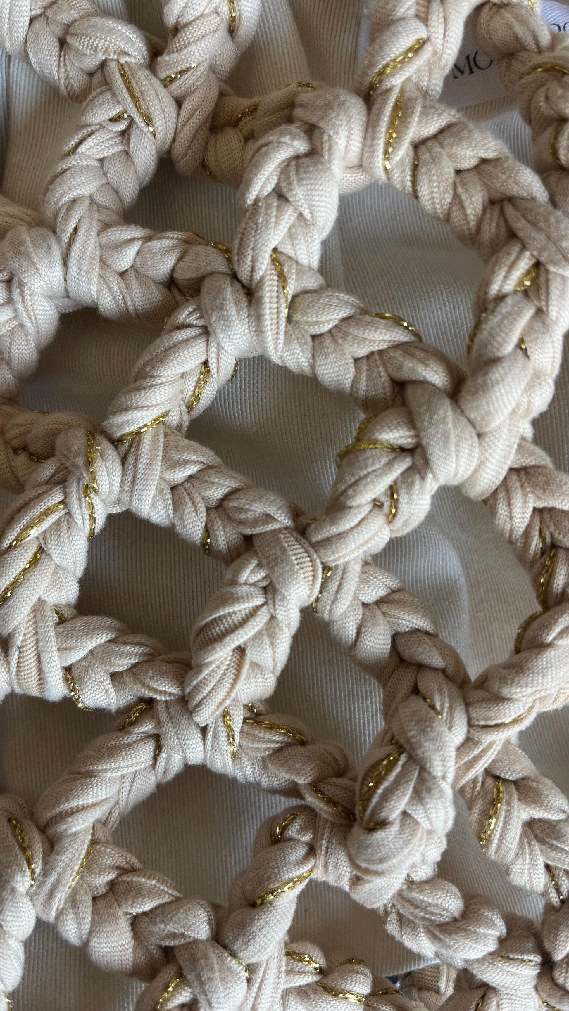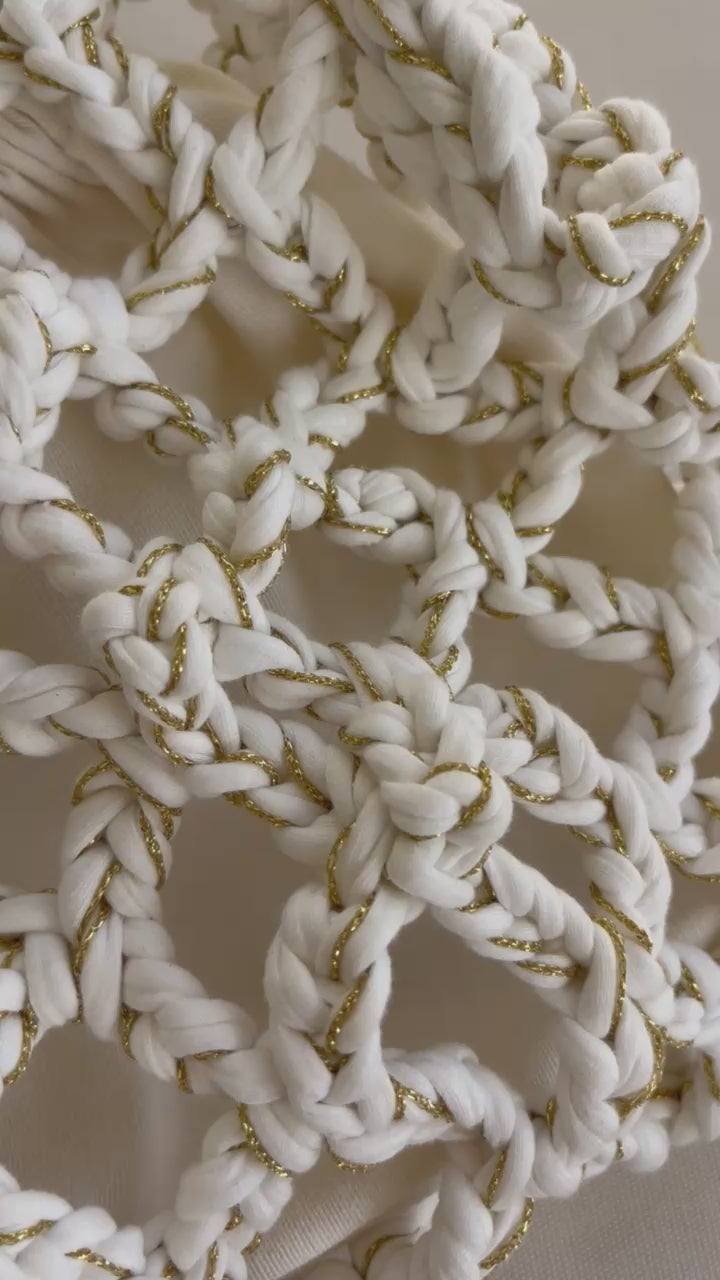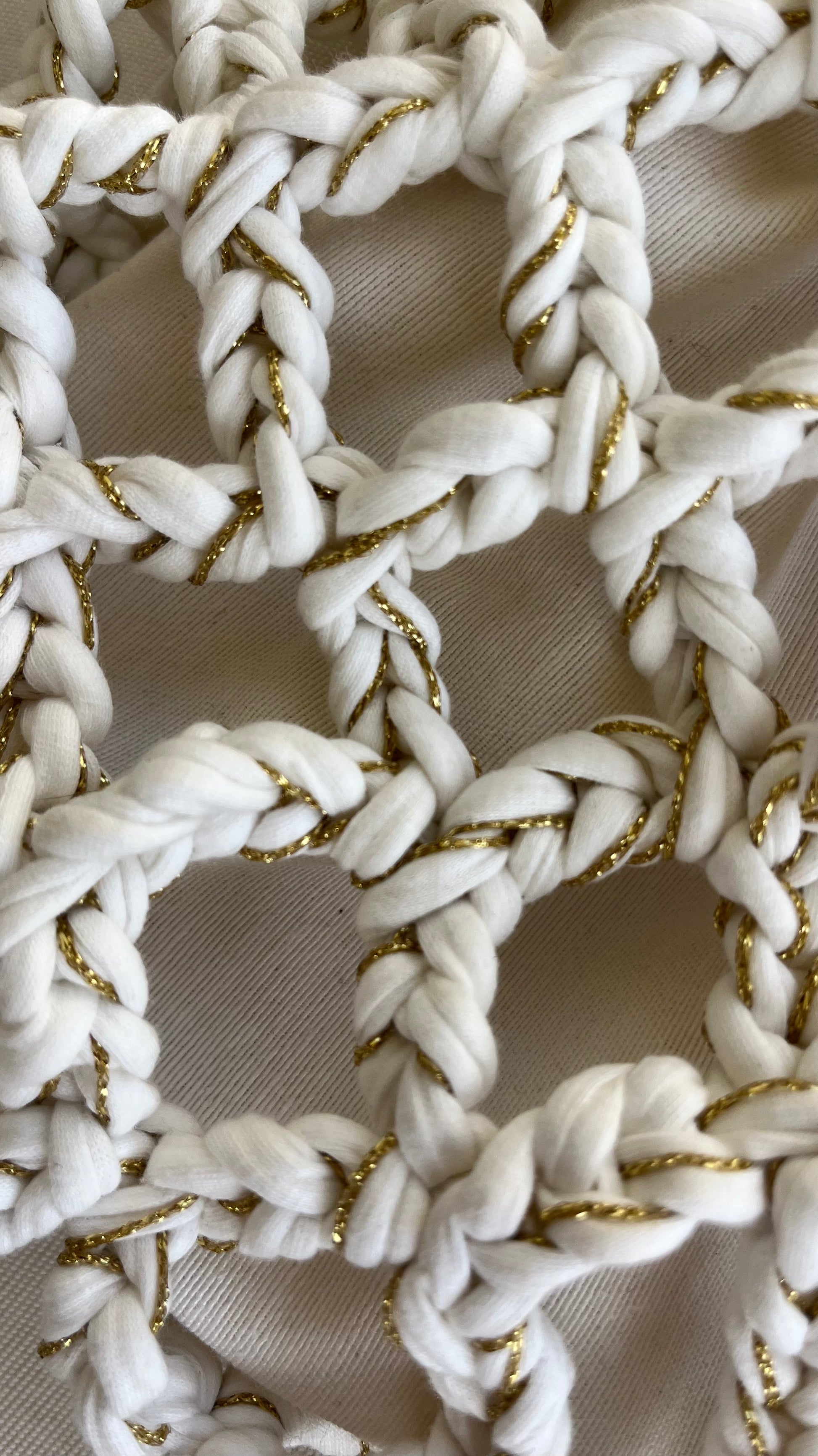 • Material: Hecho completamente a mano con trapillo e hilo dorado un material reciclado y ecológico que proporciona resistencia, suavidad y un toque artesanal inconfundible.
