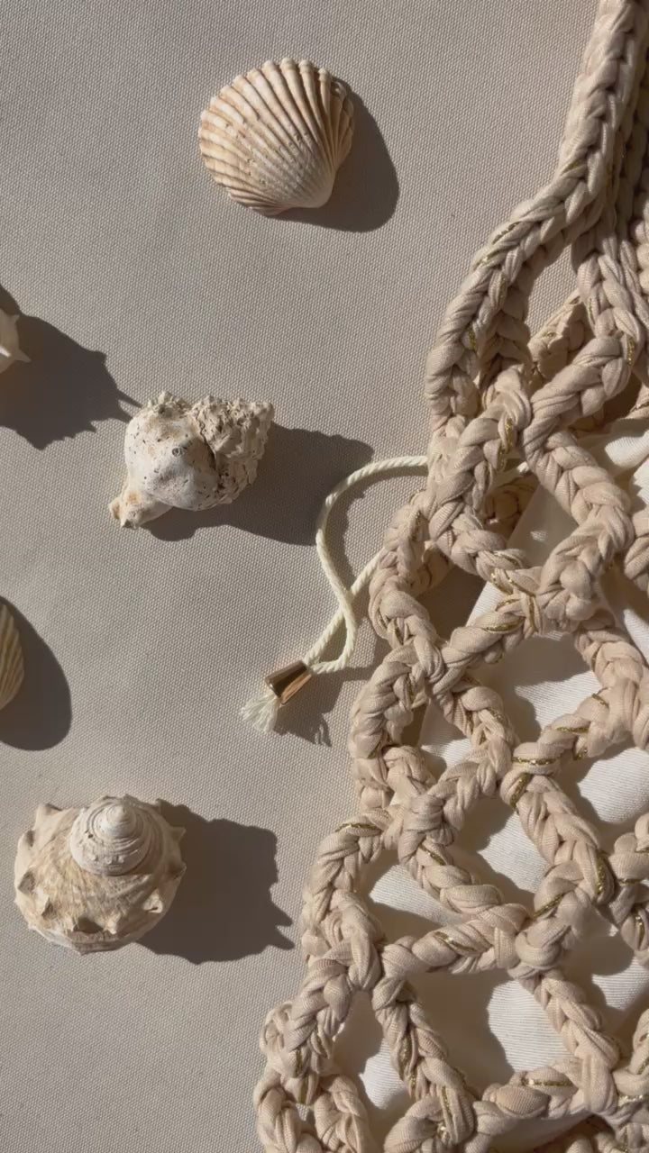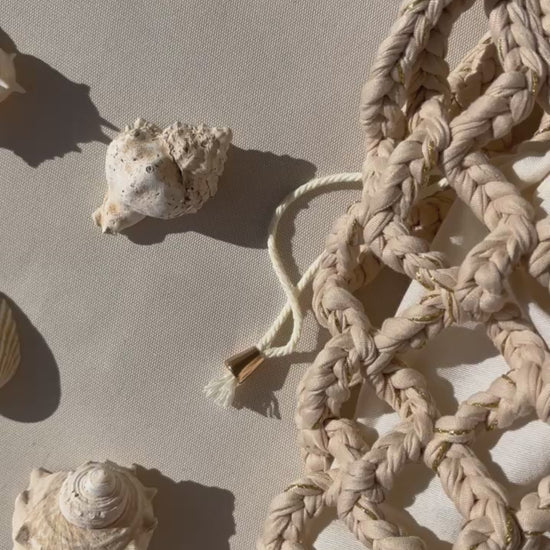 • Material: Hecho completamente a mano con trapillo e hilo dorado, un material reciclado y ecológico que proporciona resistencia, suavidad y un toque artesanal inconfundible.